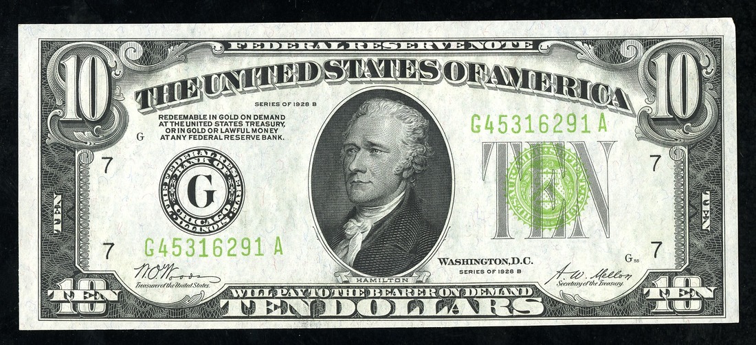 Fr. 2002-G. $10. 1928B Federal Reserve Note. No.G45316291A. G. Uncirculated, with corner tip bends.