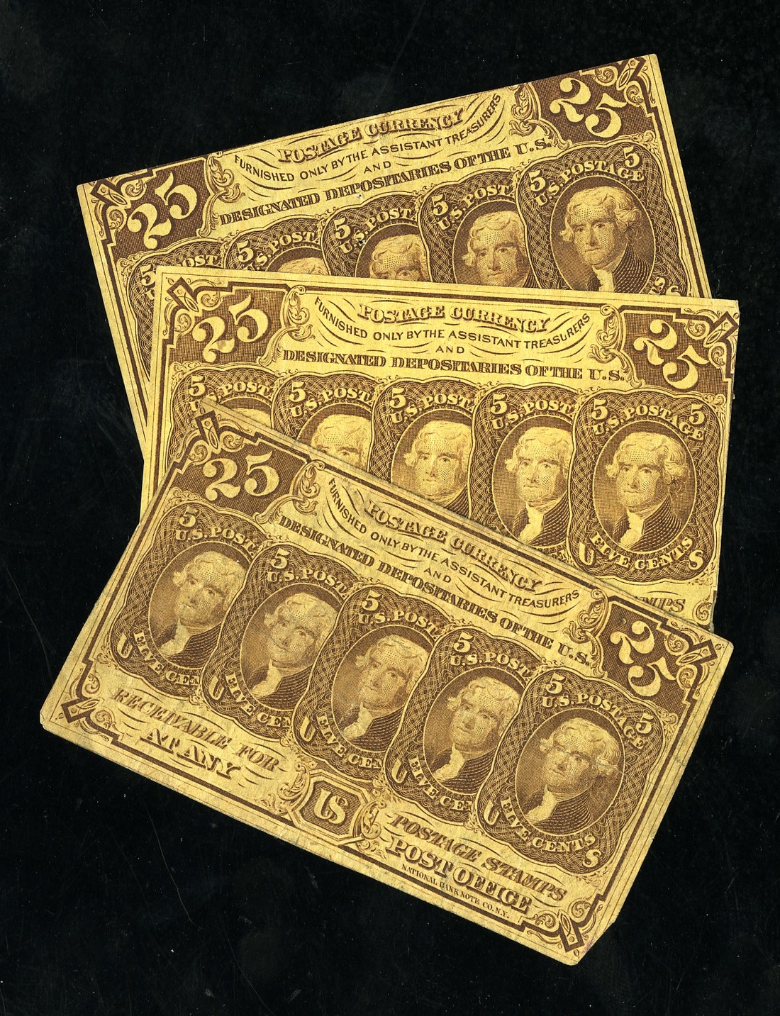 Trio of First Issue 25 Cents Fractional Currency Notes. With monogram. Fine, VF, VF-EF. [3]