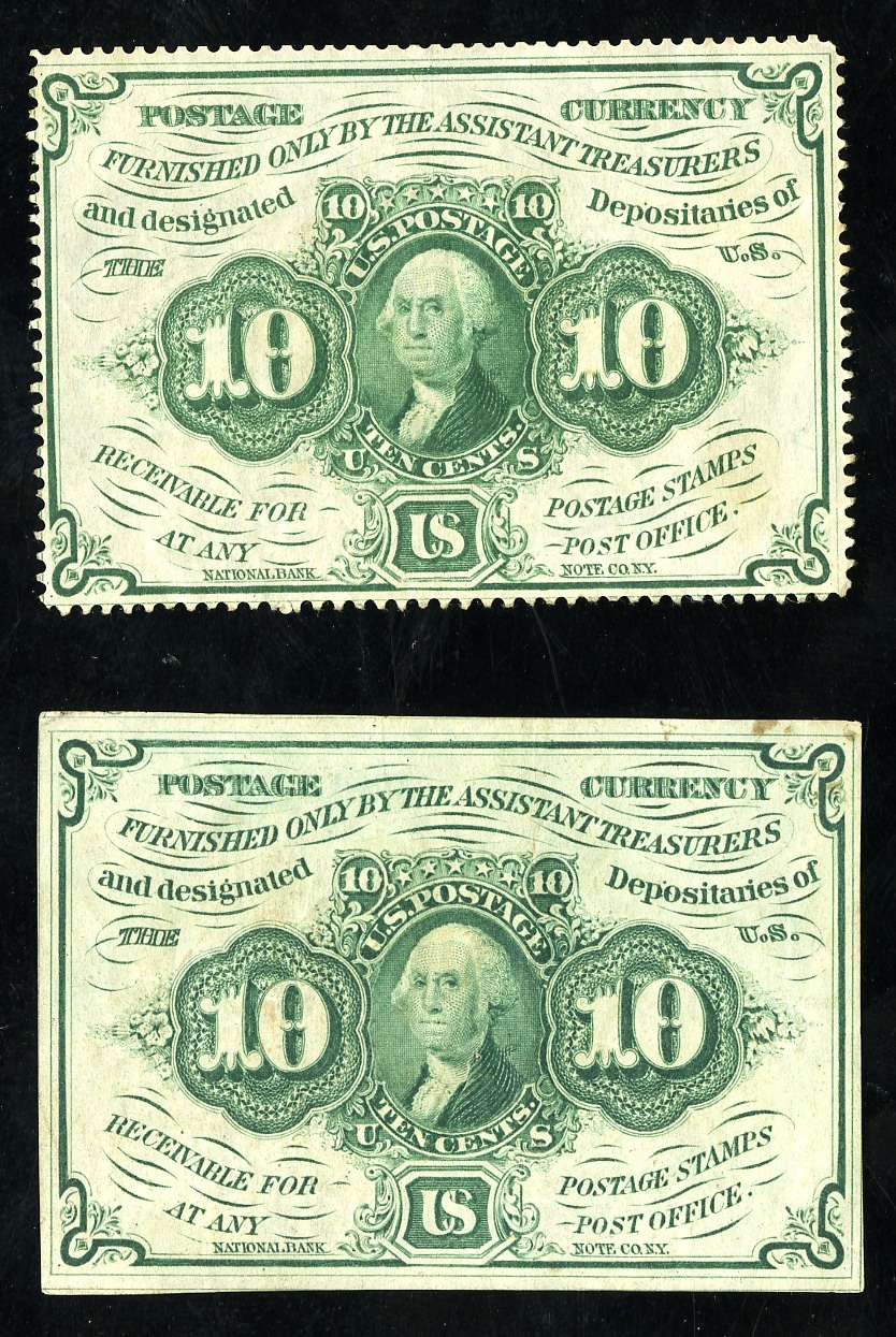 Fractional Currency Assortment. 1) 1st Issue 10 Cents, perforated, monogram, VF-EF. 2) Similar, straight edges, AU. 3) 50 Cents, straight edges, Fine. 4-6) three other damaged or questionable fractionals. [6]