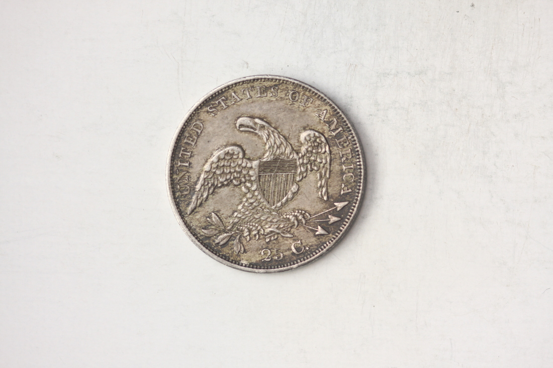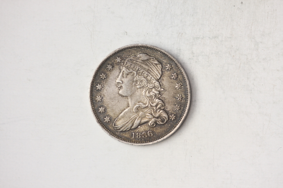 1836 Capped Bust Quarter. B-2, R.2. A lovely, fresh example of this popular variety. There are at least 4 die cracks crisscrossing each other from virtually all angles on the obverse, as well as a quite bold and dramatic die crack bisecting the reverse from 1 o'clock to 7 o'clock. Abundant mint luster under the toning and certainly worthy of a premium bid. About Uncirculated.