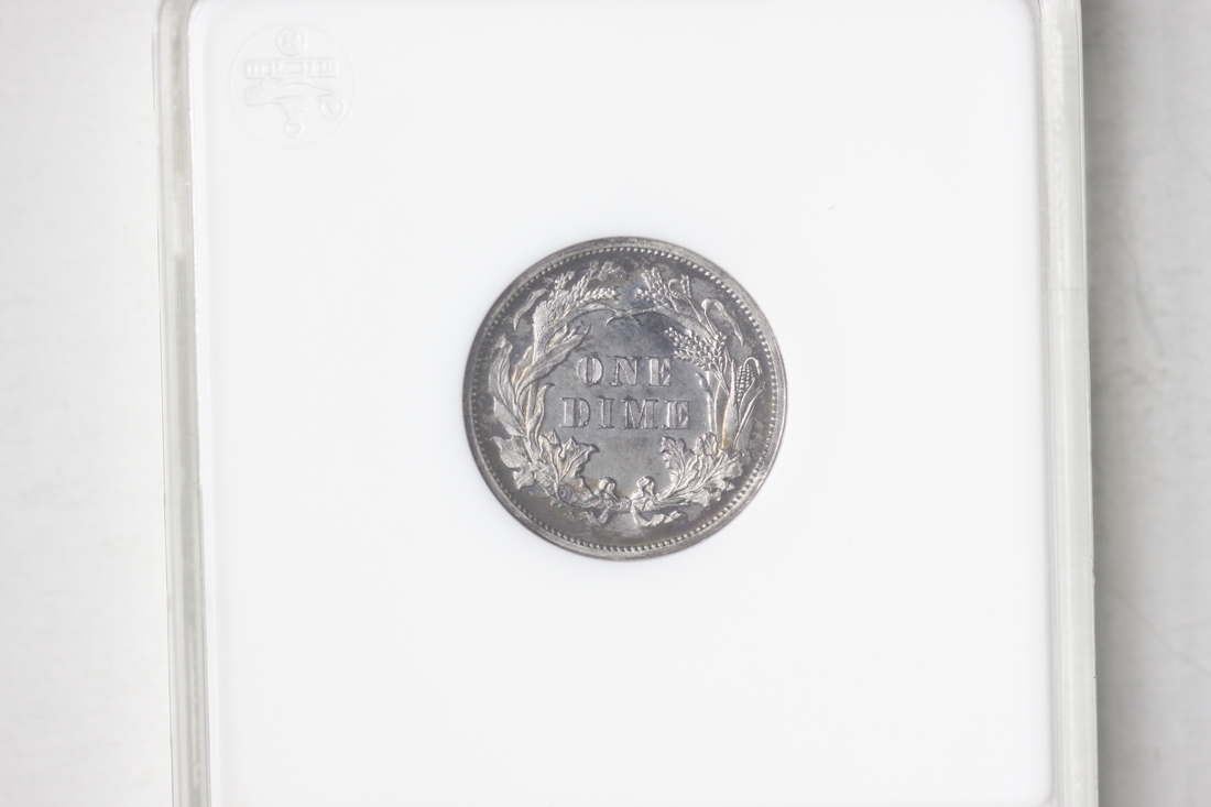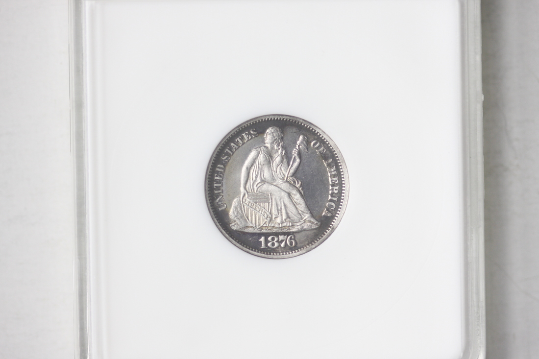 1876 Seated Liberty Dime. ANACS PF62. Some peripheral toning on both obverse and reverse. The surfaces are very smooth for what is typically seen on a PF62.