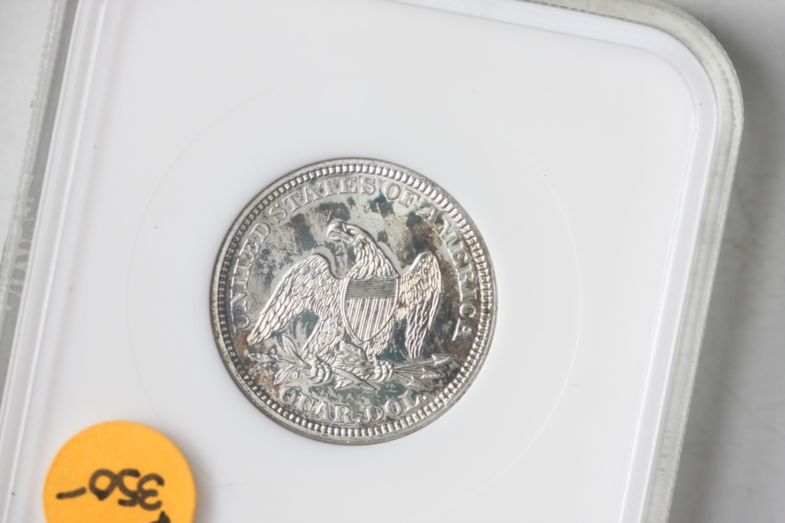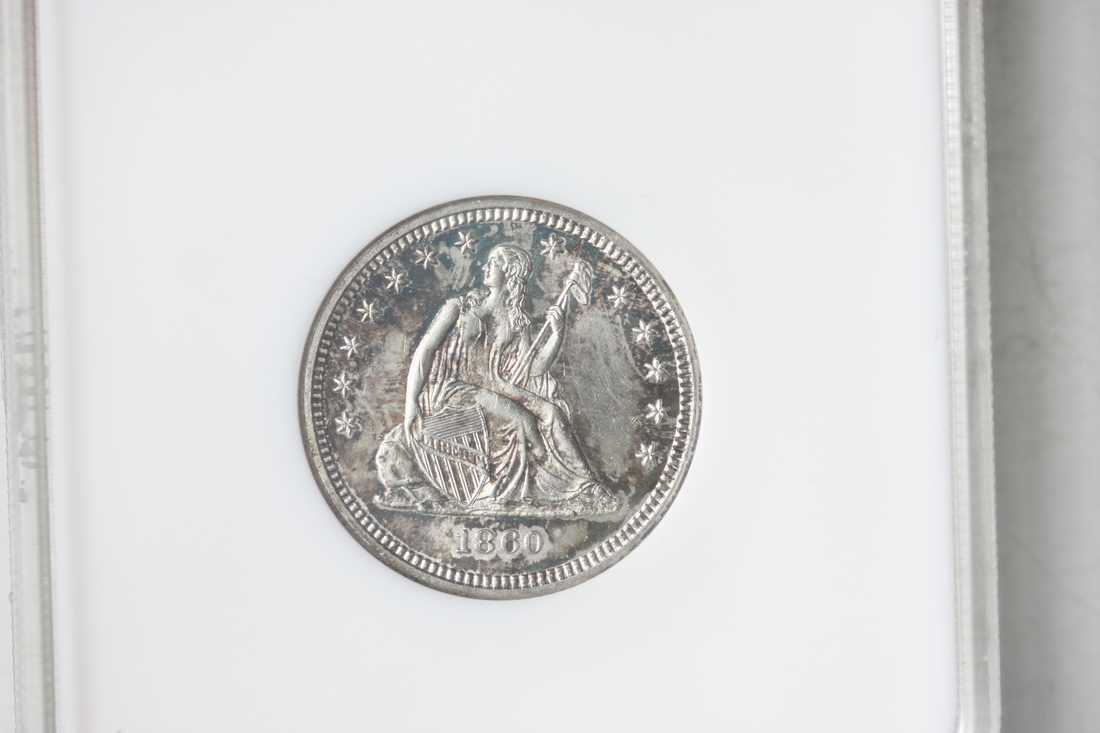 1860 Seated Liberty Quarter. NGC MS61. Beautiful luster and attractive toning with hues of champagne gold, violet, and royal blue.