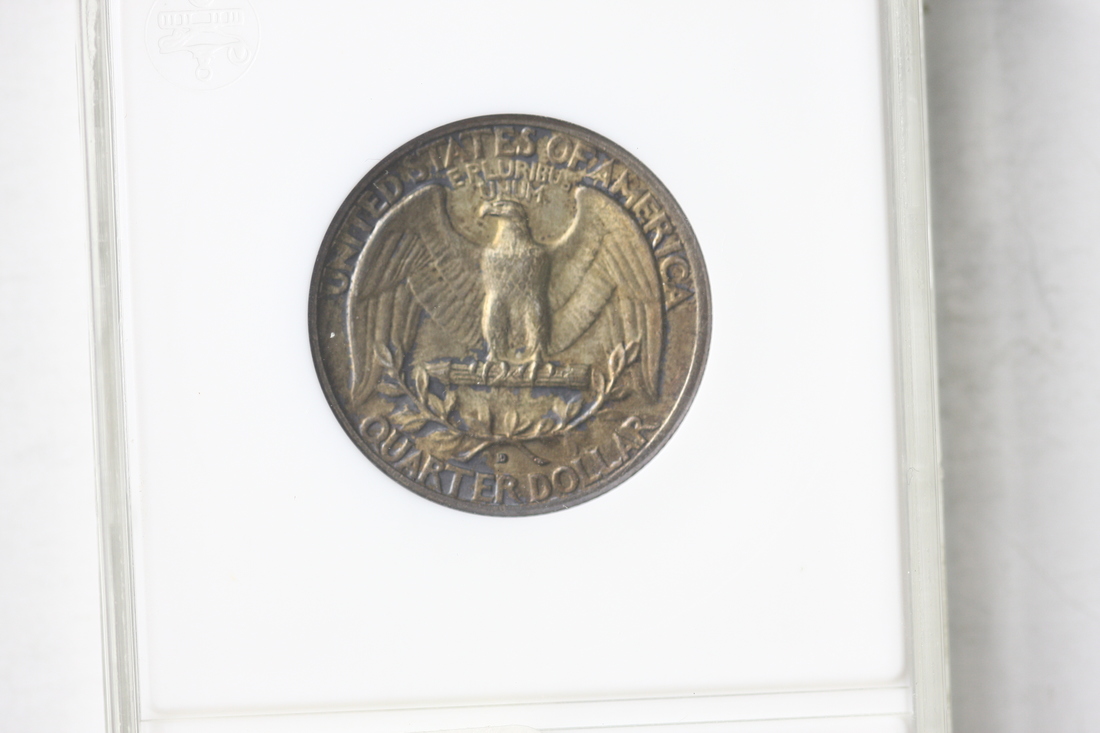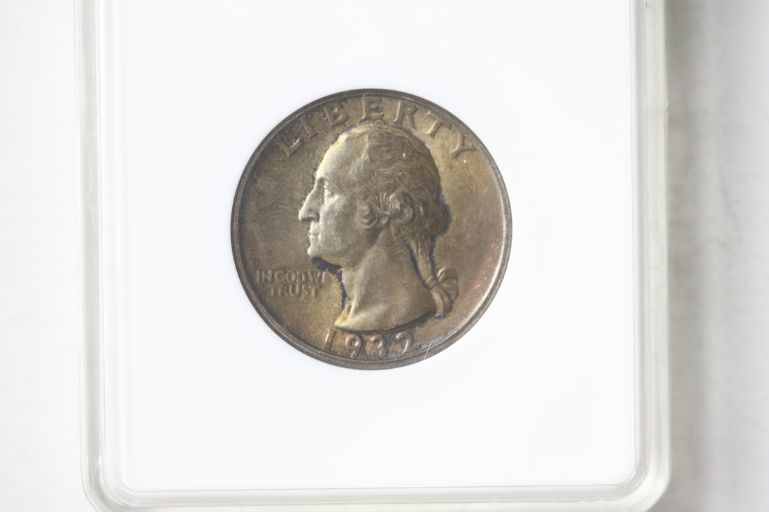 1932-D Washington Quarter. ANACS MS62. A wonderful golden, olive-green iridescence bathes both sides of this key date Washington Quarter. Very difficult to acquire in this grade and with such wondeful eye appeal.