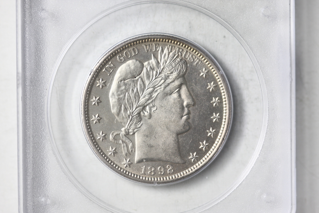 1892 Barber Half Dollar. PCGS MS62. Near cameo contrast on the obverse combines well with the lustrous, satiny surfaces of the reverse. Hopelessly undergraded by today's standards.