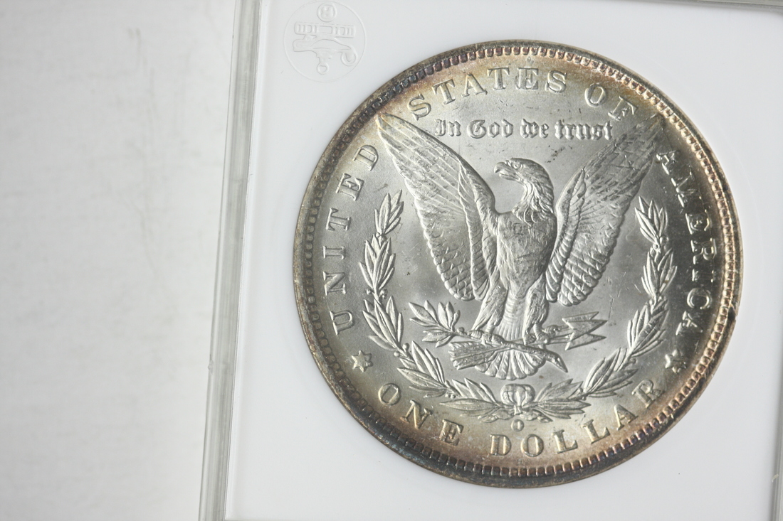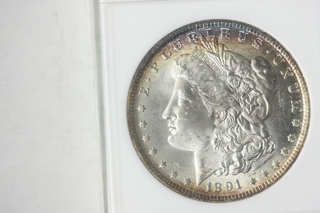 1891-O Morgan Dollar. ANACS MS63. Brilliant mint bloom and full cartwheel luster. Lovely peripheral champagne gold toning.