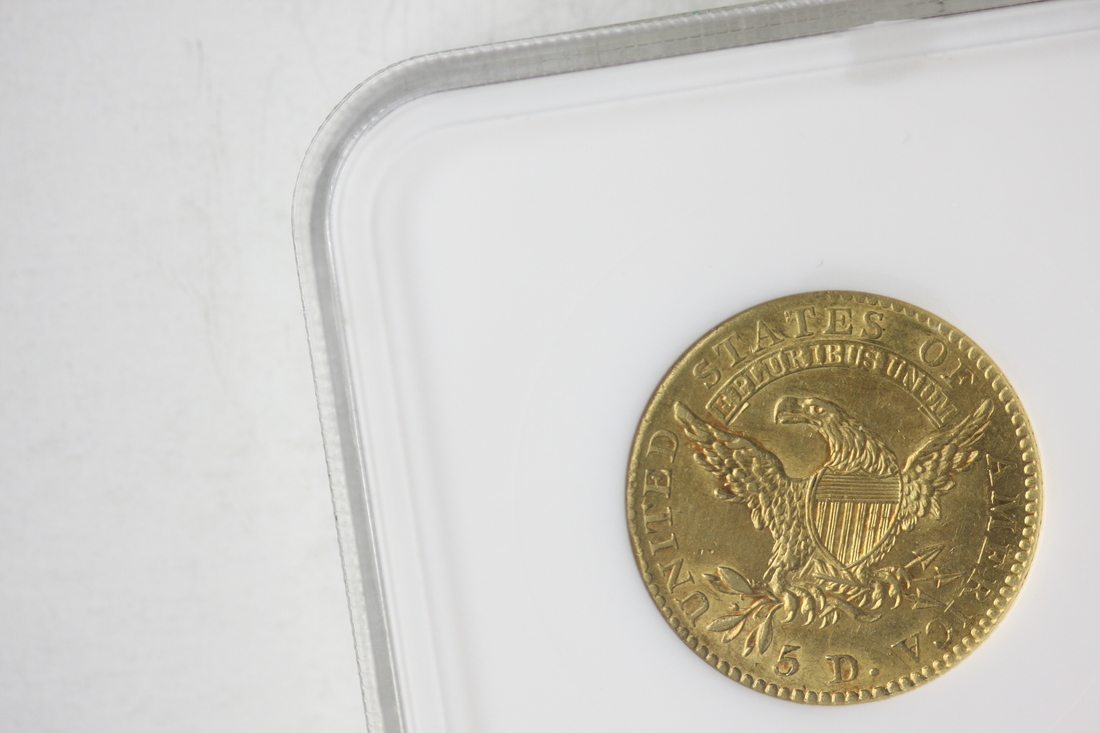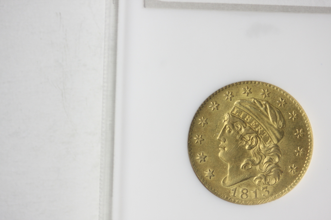 1813 $5 Capped Bust Half Eagle. NGC AU53. There are some light but noticeable scratches in the face and hair. The coin has beautiful lustre, and the patches of fiery orange-copper toning mix into the devices quite pleasingly.
