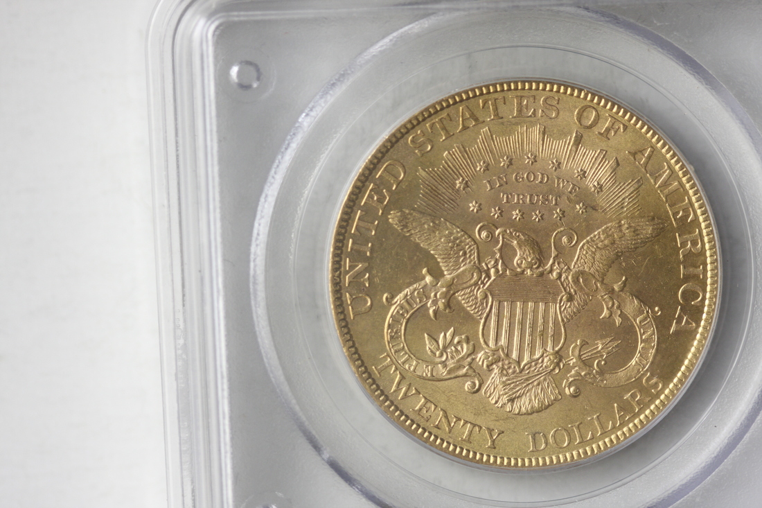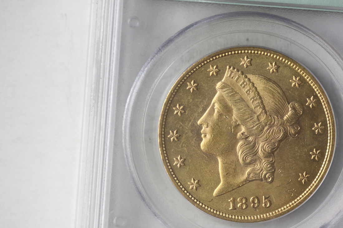 1895 $20 Liberty. PCGS AU58. Two noticeable digs in front of the ear and behind the eye, as well as other smaller contact marks on the obverse. The reverse is much smoother, and both sides have pleasing luster.