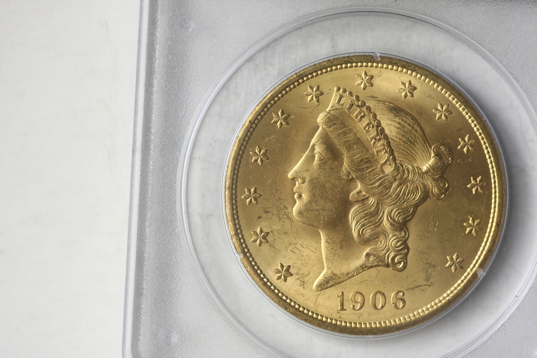 1906-D $20 Liberty. PCGS MS62. Full mint bloom under graceful hues of golden-yellow toning.