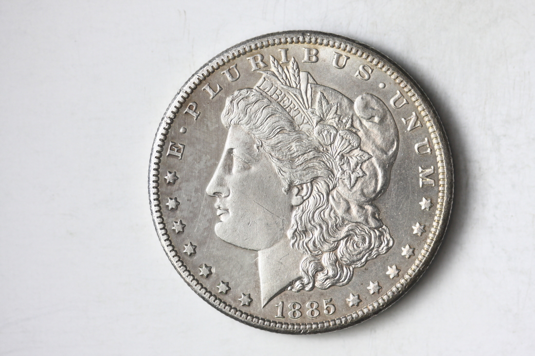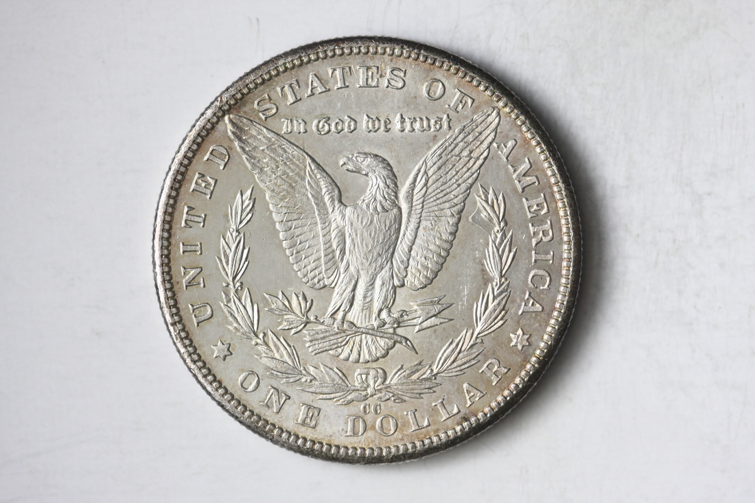 1885-CC Morgan Dollar. Uncirculated. Wonderful cartwheel luster on either side. There is however a small pin scratch across Liberty's cheek, and there are some light slide marks in the left obverse field.