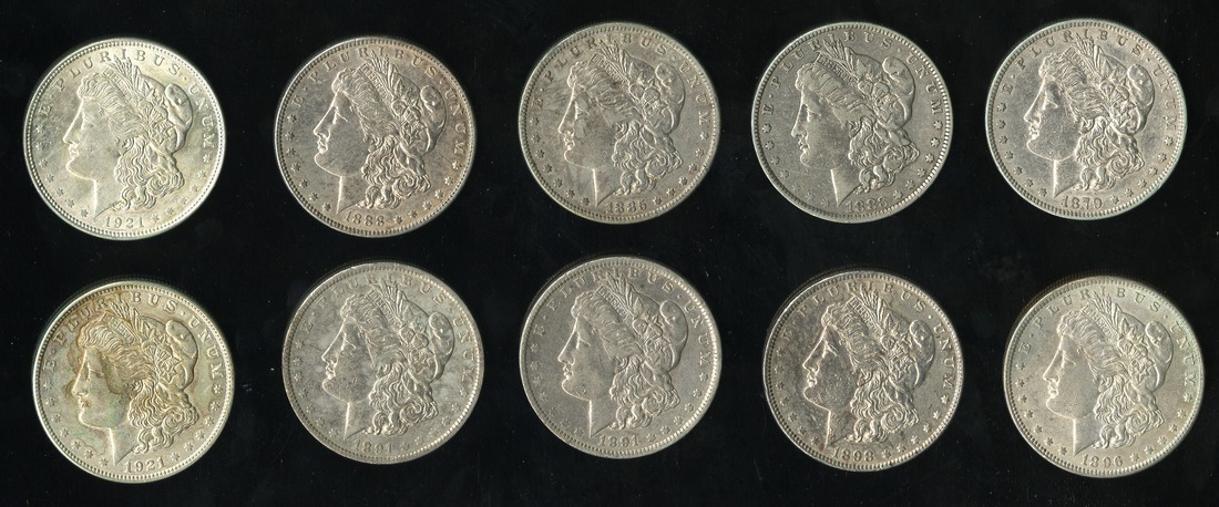 Morgan Dollar Group. 1879 EF, 1883-O VF, 1885 EF, 1888 AU, 1891 EF, 1891-O EF, 1896 AU, 1898 AU, 1921 Morgan BU(2). [9]