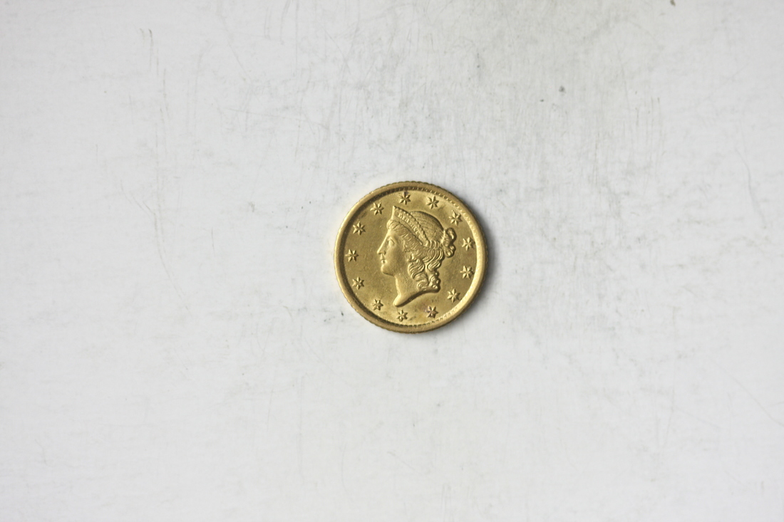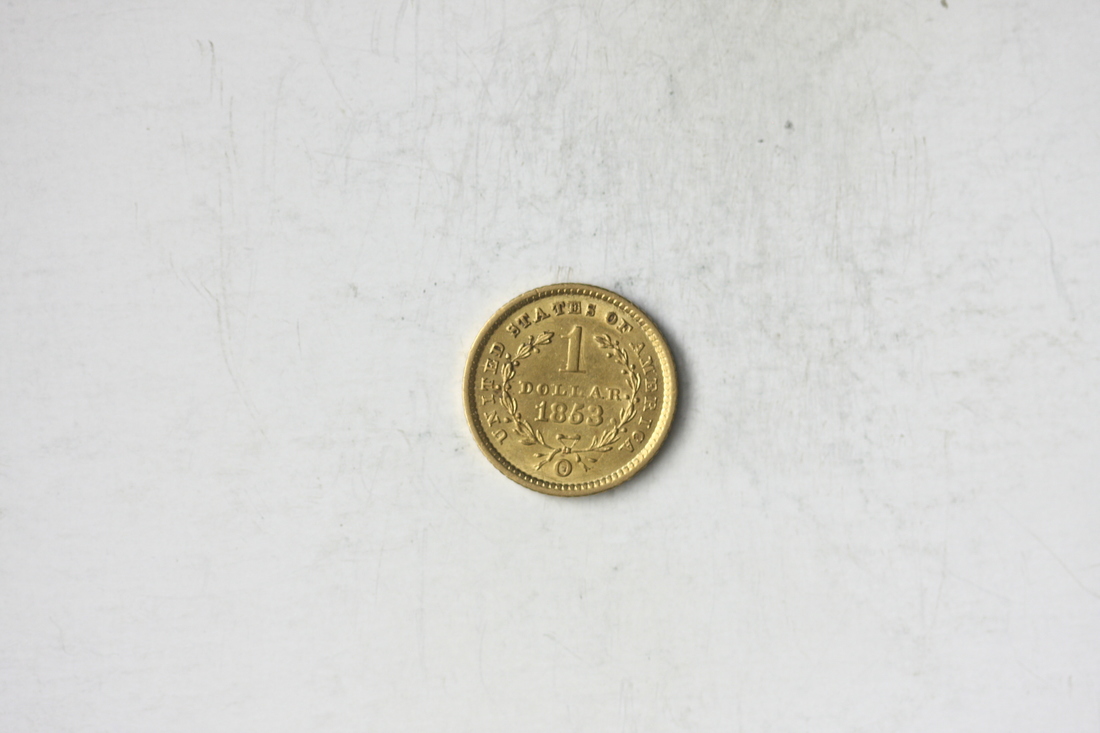 1853-O $1 Gold. About Uncirculated. Perhaps some eveidence of a light cleaning. Still plenty of luster despite that possibility.