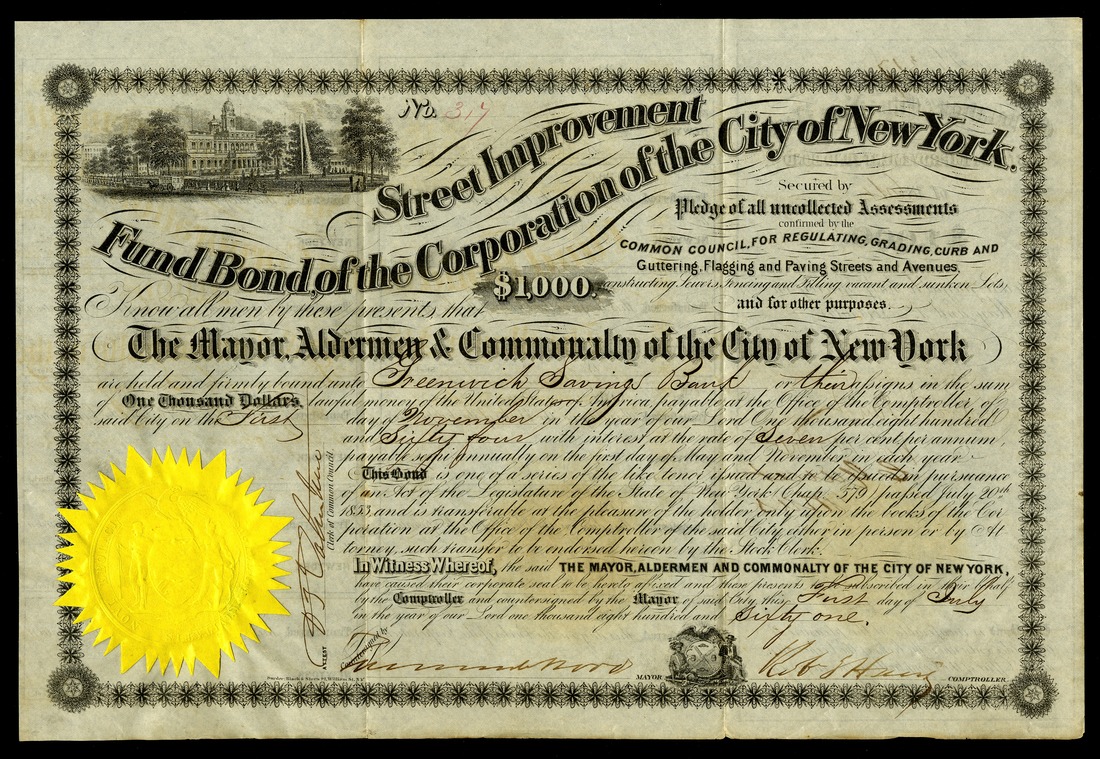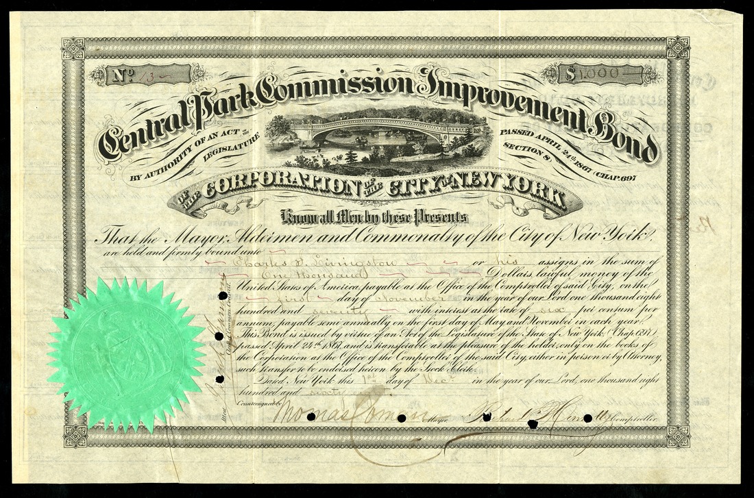 New York City Bond Pairing. [2], Central Park Commission and Improvement Bond,$1000, 6% interest, New York 1868, #13. Beautiful Bow Bridge in Central Park, IC; Street Improvement Fund Bond of the Corporation of the City of New York, $1000, 7% interest, 1861, #317. City Hall, IU, the first signed by Mayor Fernando Wood, both VF+, and much nicer than similar examples we have seen.
