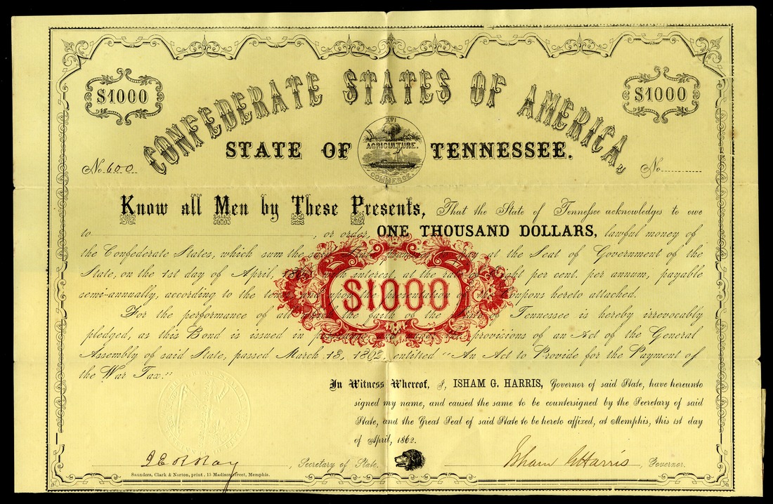 State of Tennessee, 1862, $1000, Like Cr.62, but the Redemption date is April 1, 1866, #600, round seal with Agriculture and Commerce, vivid red $1000 underprint, dog below. 5 coupons attached. VF+ with two small fold junction holes.