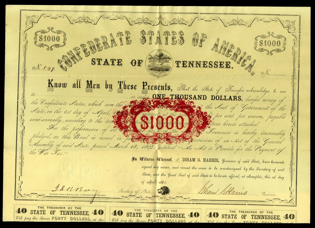 State of Tennessee, 1862, $1000 bond, like Cr.62, but with a Redemption date of April 1, 1866, #549, round seal with Agriculture and Commerce, vivid red $1000 underprint, dog below. 5 coupons attached. Second of two consecutive. VF+, a tiny fold junction hole at the center. Crisp and fresh!