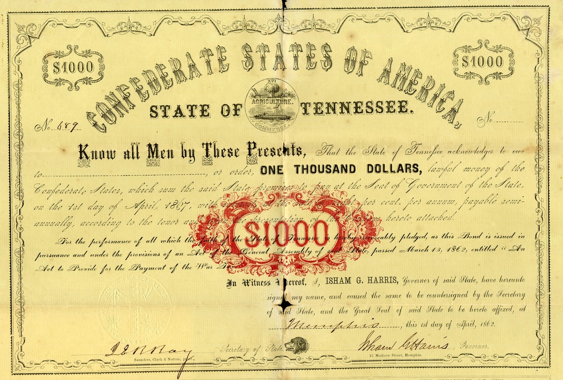 State of Tennessee, 1862, $1000 bond, Cr.62B, with a Redemption date of April 1, 1867, #689, round seal with Agriculture and Commerce, vivid red $1000 underprint, dog below. 7 coupons attached. VF, small fold junction holes and splits, piece out of the top margin.