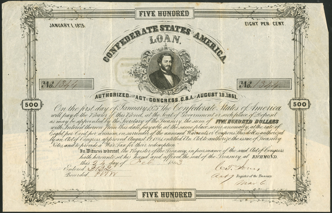 Act of August 19th 1861, 8% Loan, a group of 3 bonds for $500, redeemable January 1875 (Ball 90), vignette of J.P.Benjamin in centre, black, with coupons, trimmed top edges, F/VF (3)