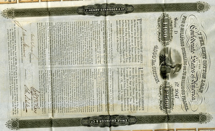 Act of January 29, 1863, Cotton Loan Bond issued in Europe by J. Henry Schroder & Co. and Emile Erlanger & Co. 100 Pounds Sterling, 2,500 French Francs, 4,000 Pounds of Cotton. Ball 156. Cr. 116. #2047. Orange-brown. On high quality heavily watermarked paper. Ornately engraved, with Liberty holding the Confederate "Stars and Bars" flag, and gazing out across the sea. 36 coupons. The most attractive and popular Confederate bond issue. VF+, fresh and bright.