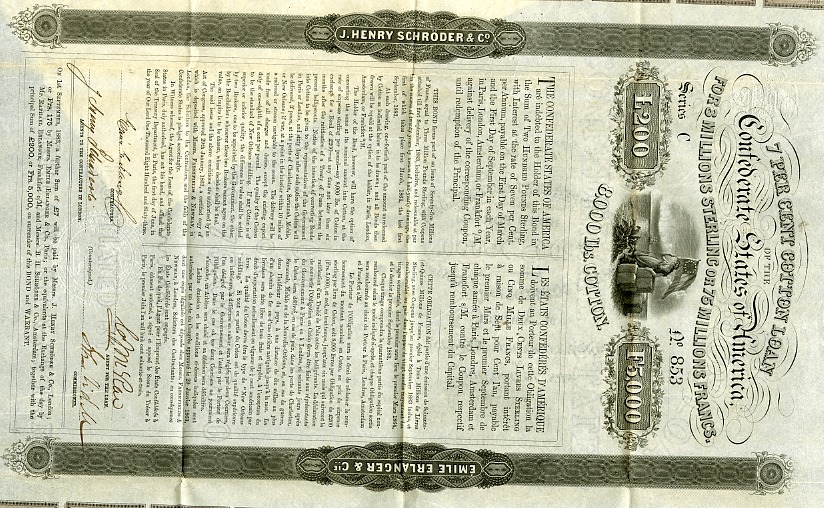 Act of January 29, 1863, Cotton Loan Bond issued in Europe by J. Henry Schroder & Co. and Emile Erlanger & Co. 200 Pounds Sterling, 5,000 French Francs, 8,000 Pounds of Cotton. #853. Ball 157. Cr.117. Beige. On high quality heavily watermarked paper. Ornately engraved, with Liberty holding the Confederate "Stars and Bars" flag, and gazing out across the sea. 36 coupons. The most attractive and popular Confederate bond issue. VF+, several pinholes.