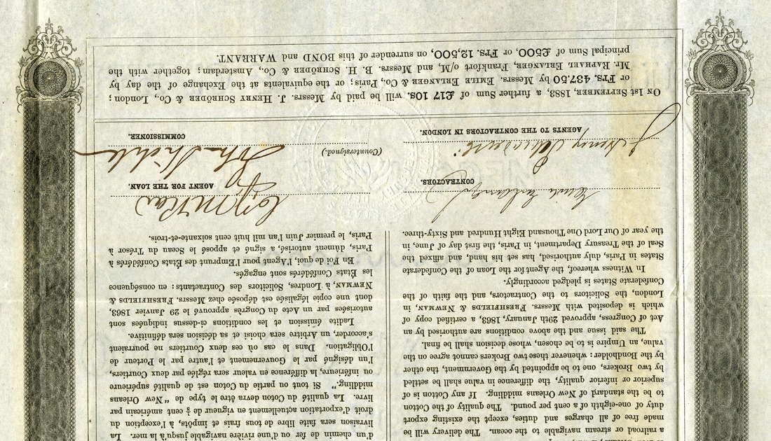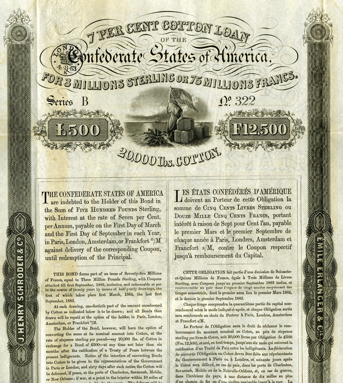 Act of January 29, 1863, Cotton Loan Bond issued in Europe by J. Henry Schroder & Co. and Emile Erlanger & Co. 500 Pounds Sterling, 12,500 French Francs, 20,000 Pounds of Cotton. Ball 158. Cr. 118. #322. Greyish-brown. On high quality heavily watermarked paper. Ornately engraved, with Liberty holding the Confederate "Stars and Bars" flag, and gazing out across the sea. 36 coupons. The most attractive and popular Confederate bond issue. VF+, fresh and crisp.