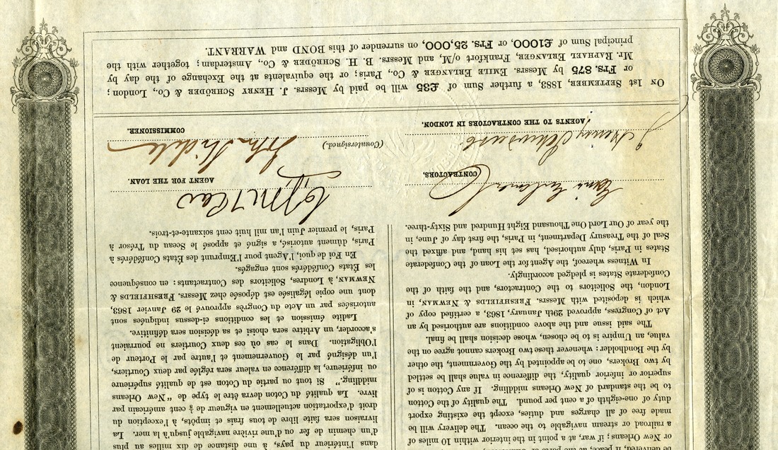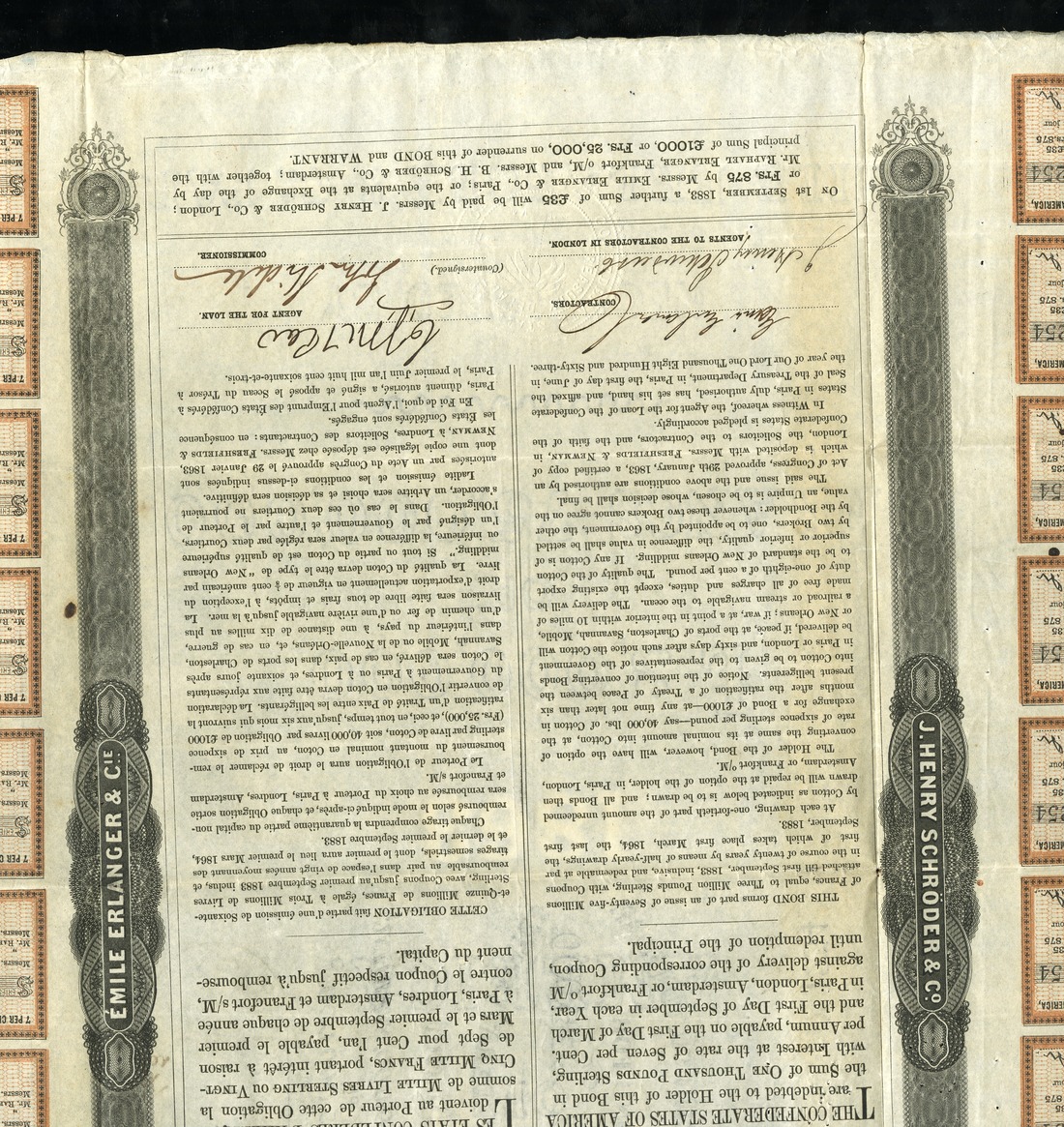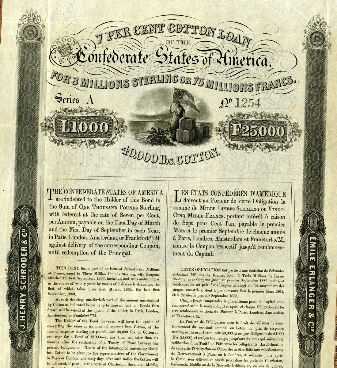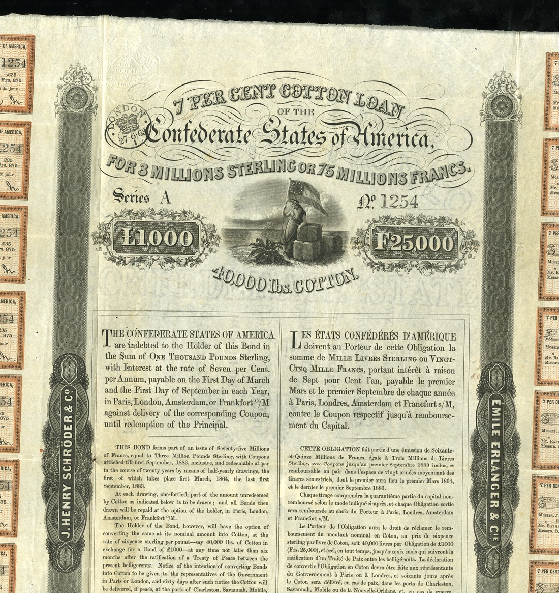 Act of January 29, 1863, Cotton Loan Bond issued in Europe by J. Henry Schroder & Co. and Emile Erlanger & Co. 1,000 Pounds Sterling, 25,000 French Francs, 40,000 Pounds of Cotton. Ball 159. Cr. 119. #1254. Orange. On high quality heavily watermarked paper. Ornately engraved, with Liberty holding the Confederate "Stars and Bars" flag, and gazing out across the sea. 36 coupons. The most attractive and popular Confederate bond issue, and the highest denomination. VF+, some pinholes.