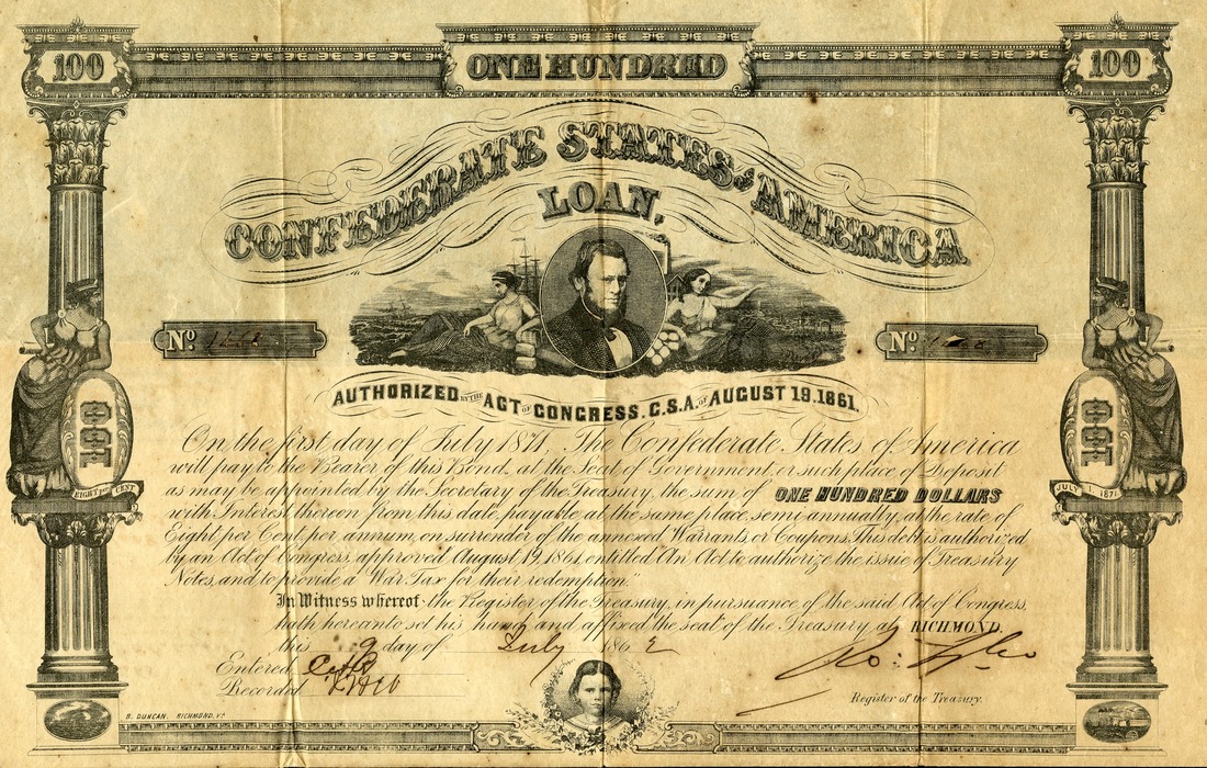 Confederates States of America Bonds, August 19, 1861 Act, 1) Ball 67, Cr. 32, $100 bond payable July 1, 1871, Bragg, 15 coupons, VF+, minor stains. 2) Ball 120, Cr. 72, $500 bond payable July 1, 1879, Watt, signed by Tyler, 32 coupons, VF+, tiny fold junction split. 3) Ball 135, Cr. 102, $1,000 bond payable July 1, 1881, Memminger, signed by Jones, 36 coupons, VF+, small fold junction split. [3]