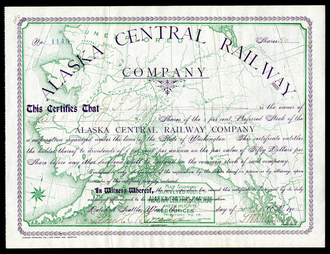 Alaska Central Railway Company, office in Seatle, Washington, $50 shares, 1903, No. 1143, full length and width green and purple map of the railroad's route, IU, VF+, crisp and clean.