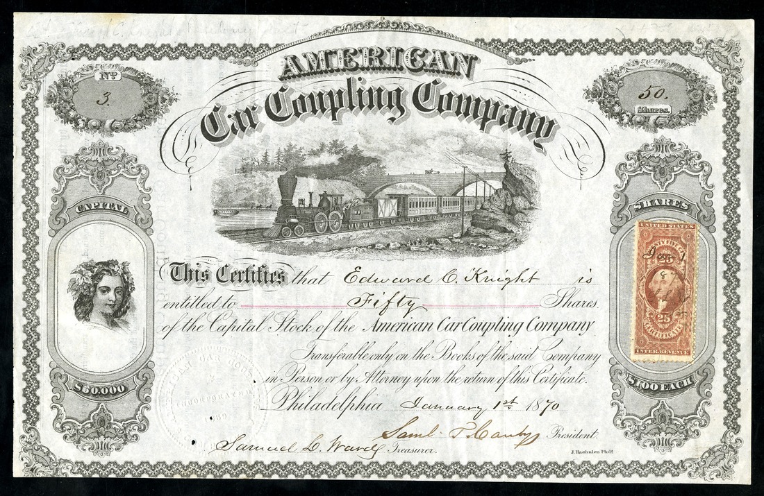 American Car Coupling Company, (PA), $100 shares, 1870, No. 3, passenger train, bridge beyond, revenue affixed beyond, IC, VF+, pinholes through the embossed seal.