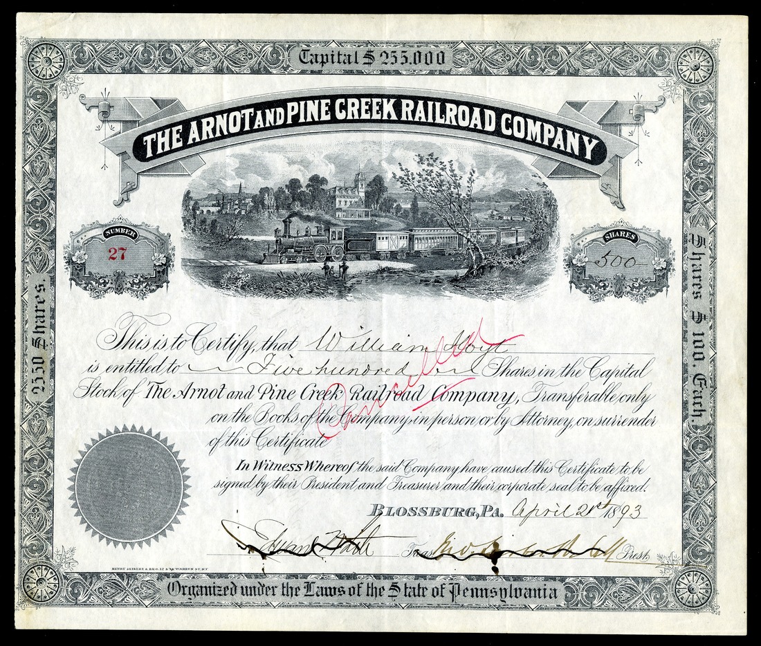 Arnot and Pine Creek Railroad Company (PA), Blosburg, $100 shares, 1893, No. 27, train passing brook, Victorian building and church beyond, IC, VF+.