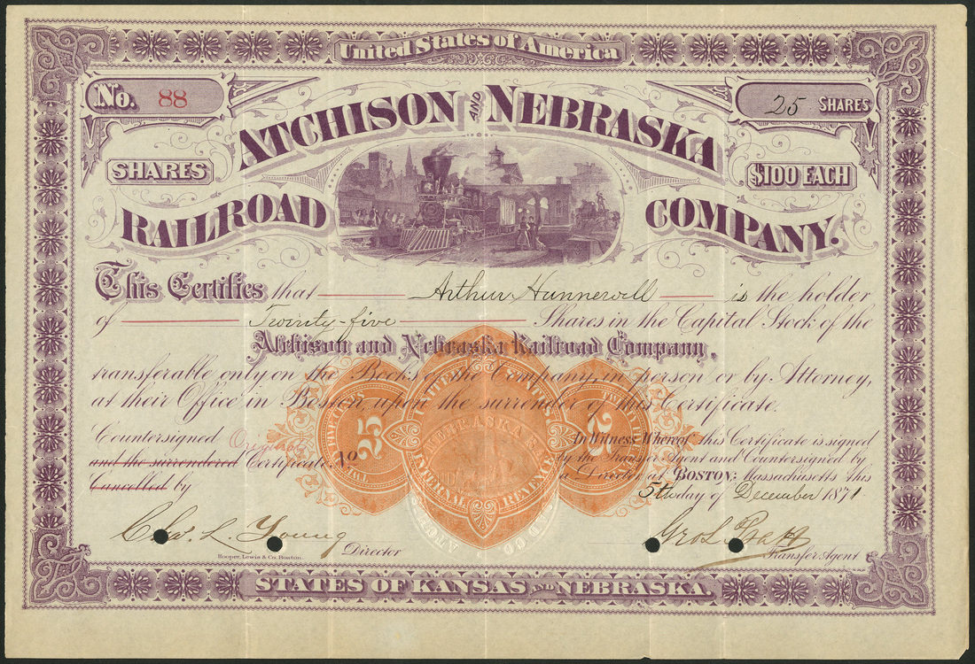 Atchison and Nebraska Railroad Co. (KS/NE), $100 shares, Boston 187[1], #88, steam train at top, ornate border, purple, ornate 25 cent imprinted revenue stamp, small hole cancels in signature area, VF and rare