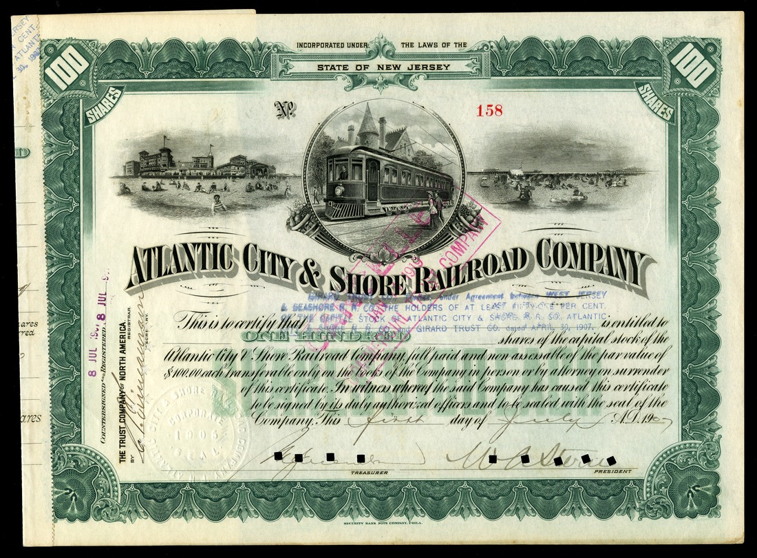Atlantic City and Shore Railroad Company, (NJ), 100 shs, 1907, No. 158, green frame, streetcar in circular frame, beach resorts and bathers, IC, VF+, stub lightly pasted over the border.