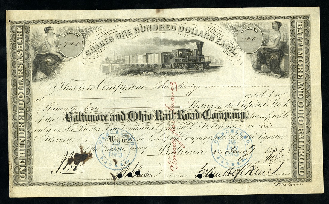 Baltimore and Ohio Rail-Road Company, (MD), $100 shares, 1856, No. 19472, signed by Johns Hopkins as President Pro Tem, train, women in the top corners, IC, ink blot and minor stain, otherwise VF+.