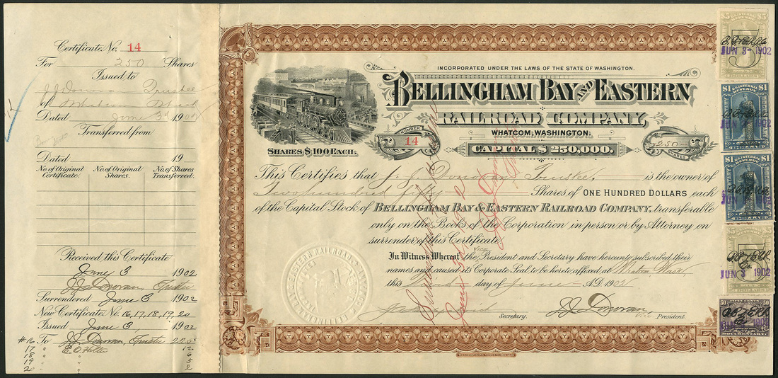 Bellingham Bay and Eastern Railroad Co. (WA), $100 shares, Whatcom, Washington 19[02], #14, train passing station at top left, ornate border, black and brown, counterfoil re-glued at left, adhesive revenue stamps down right edge, EF