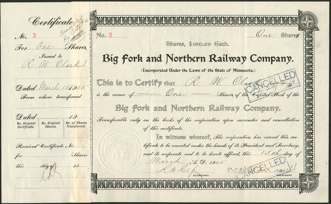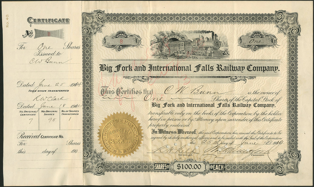 Big Fork and International Falls Railway Company, $100 shares, 19[04], #8, black and gold, vignette of steam train at top, embossed seal, hole punched in signature area, counterfoil re-glued, together with Big Fork and Northern Railway Co., $100 shares, 19[05], #3, black print, embossed seal, counterfoil re-glued, VF-EF (2)