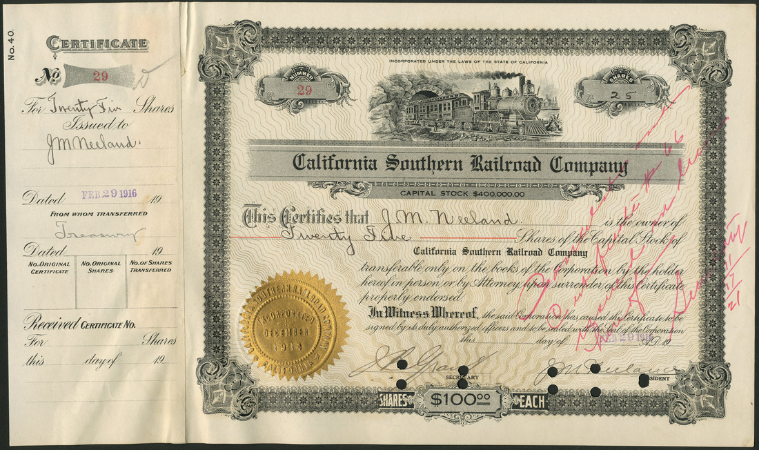 California Southern Railroad Company (CA), $100 shares, 19[16], #29, ornate border, steam train exiting tunnel at top, black with gold underprint, gold seal, hole cancelled, hand written cancellation note dated 1921 on face, EF