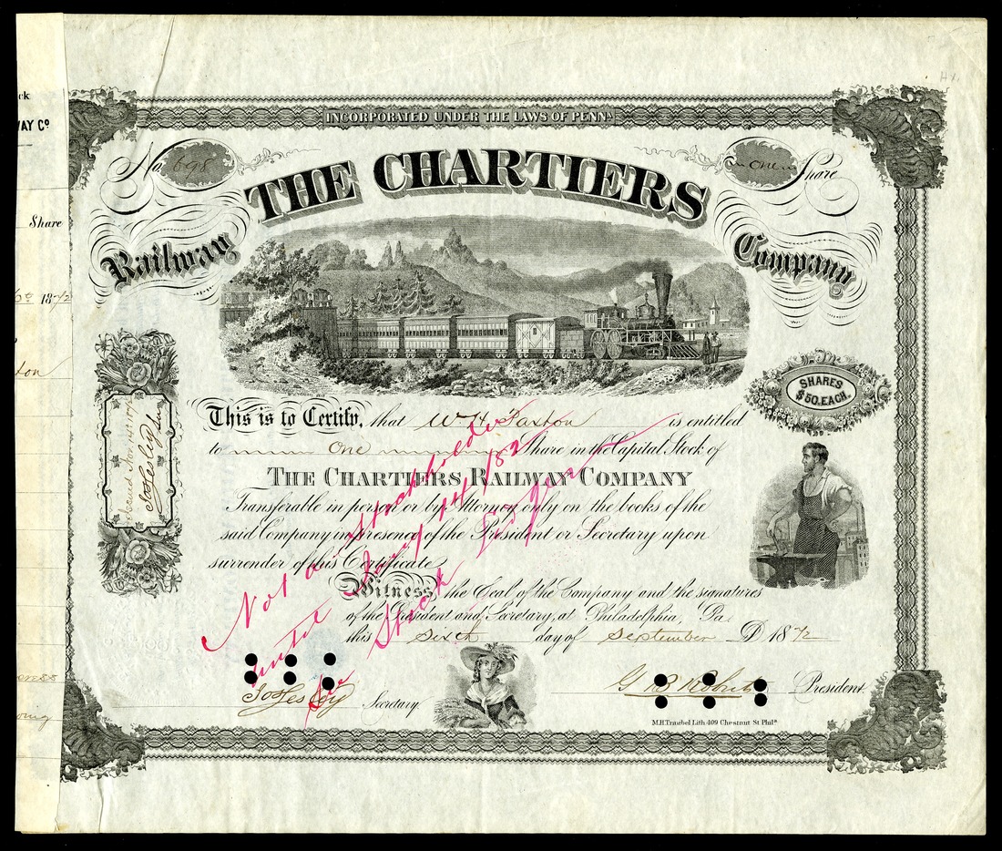 Chartiers Railway Company, (PA), $50 shares, Philadelphia 18[72], No. 698, passenger train, mountains, blacksmith, IC, VF+, stub pasted over left border, one of the nicer examples of this scarcer Penn Central issue.