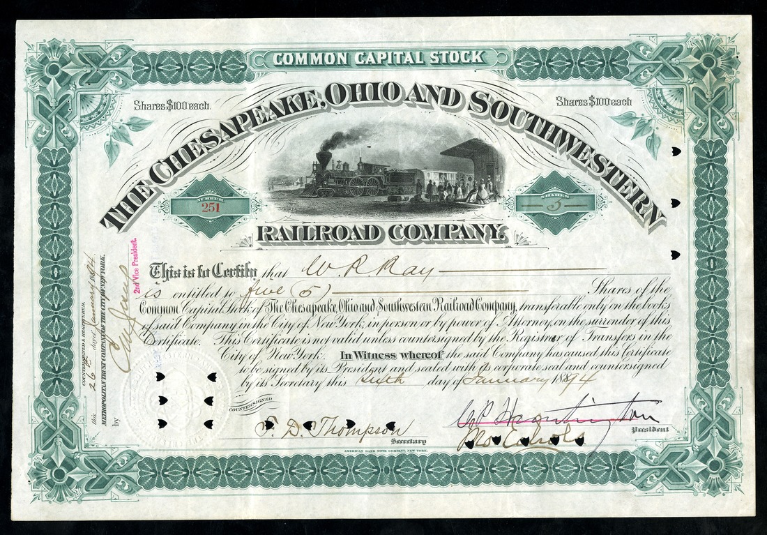 Chesapeake, Ohio, and Southwestern Railroad Company, $100 shares, 1894, No. 251, signed by Collis P. Huntington as President, green frame, train at station, IC, VF+.
