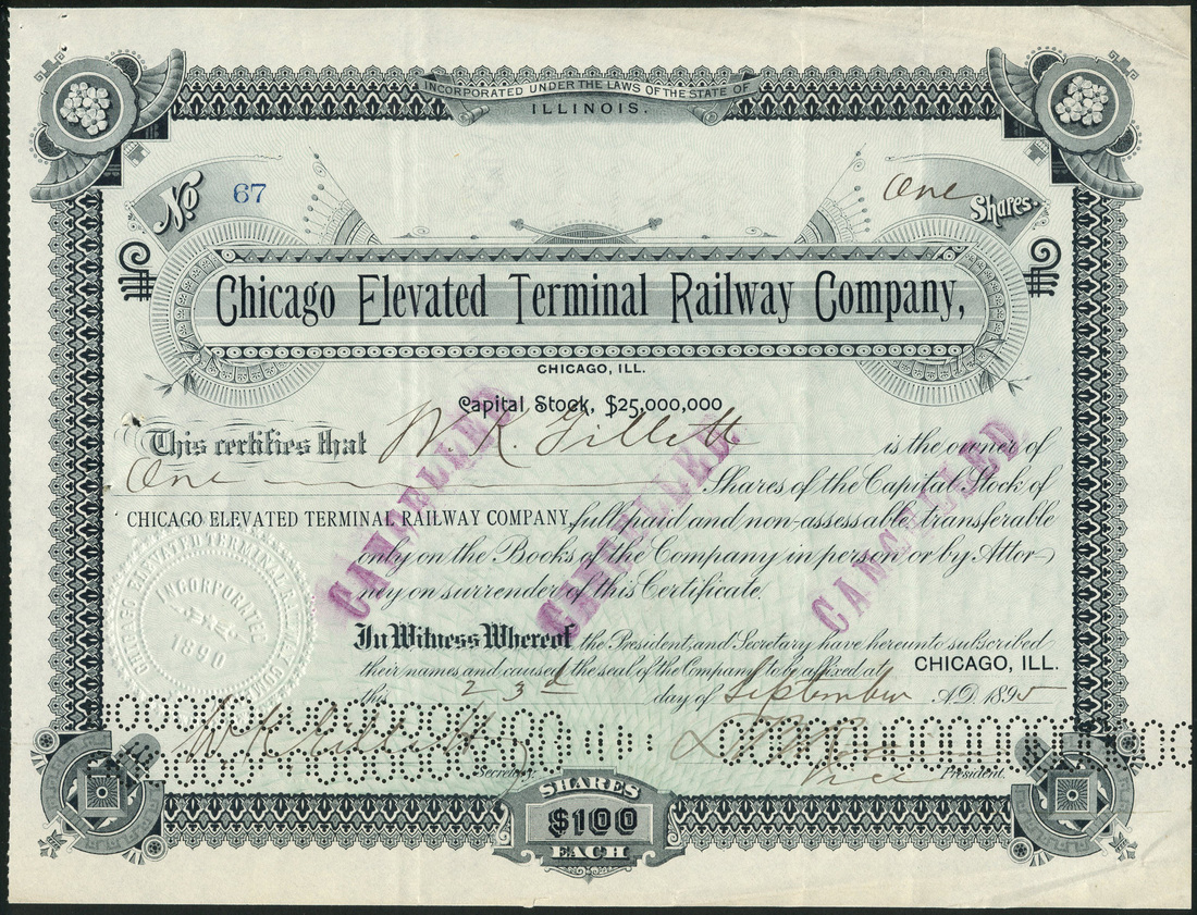 Chicago Elevated Terminal Railway Company (IL) $100 shares, 198[5], #67, ornate border, company title in panel top centre, embossed seal low left, perforated and stamped cancelled, AVF and scarce