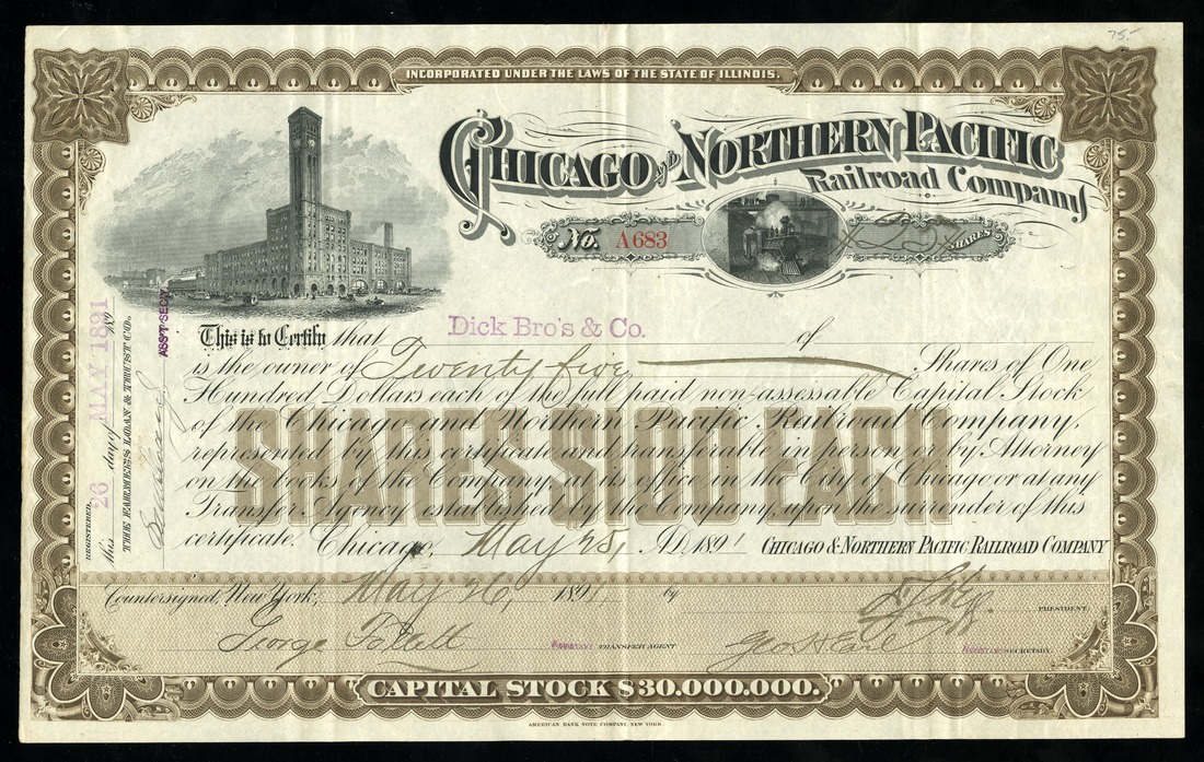 Chicago and Northern Pacific Railroad Company, (IL), $100 shares, 1891, No. A683, large terminal, left, locomotive in a small oval frame, right, IU, VF+.