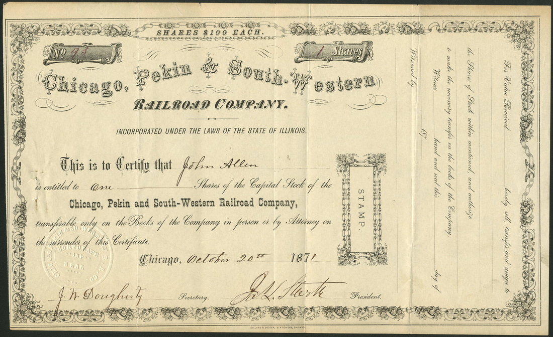 Chicago, Pekin & South Western Railroad Company (IL), $100 shares, Chicago 1871, #95, delicate floral border, black, embossed seal at bottom left, with counterfoil, VF and rare.