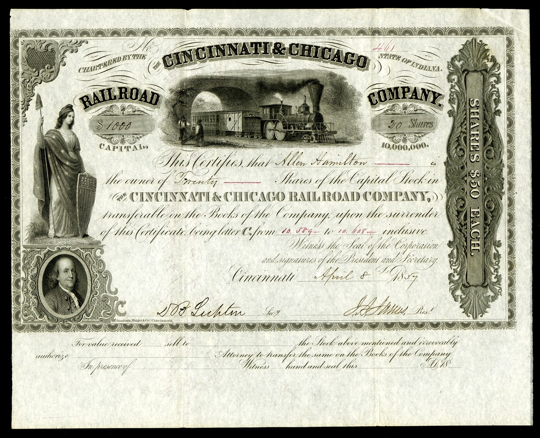 Cincinnati & Chicago Railroad Company (IN), $50 shares, 1857, No. 4111, train passing under arched bridge, Liberty with sword, Franklin, embossed seal, Danforth, Wright, IU, VF+, very nice grade for this issue.