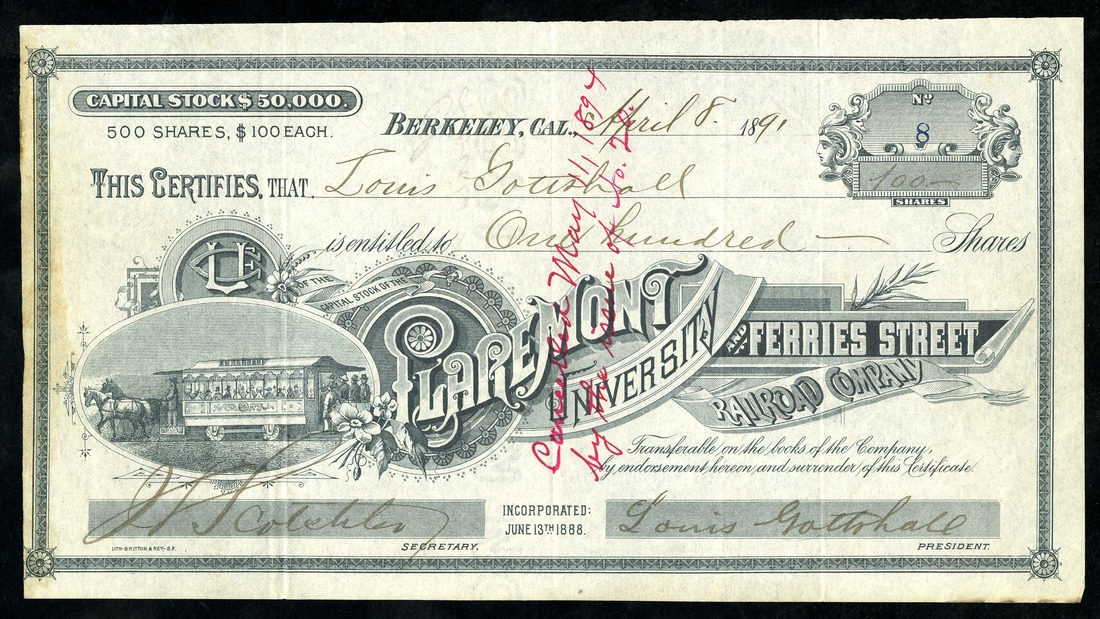 Claremont University and Ferries Street Railroad Company, Berkeley, $100 shares, 1891, No. 8, Horse drawn streetcar, IC, VF+, heavy red pen cancel. Scarce.