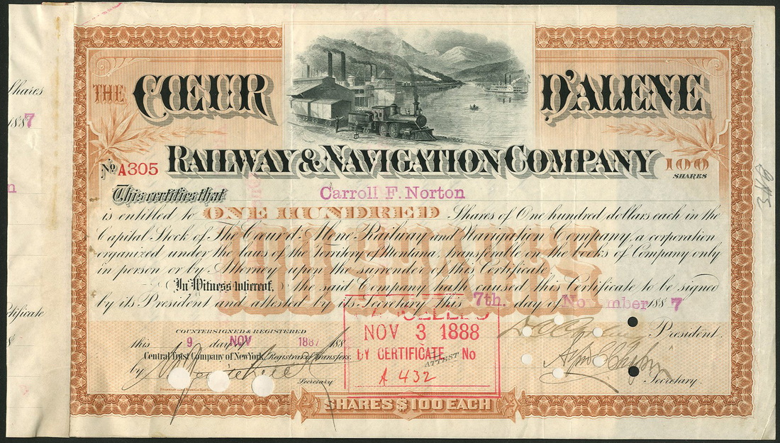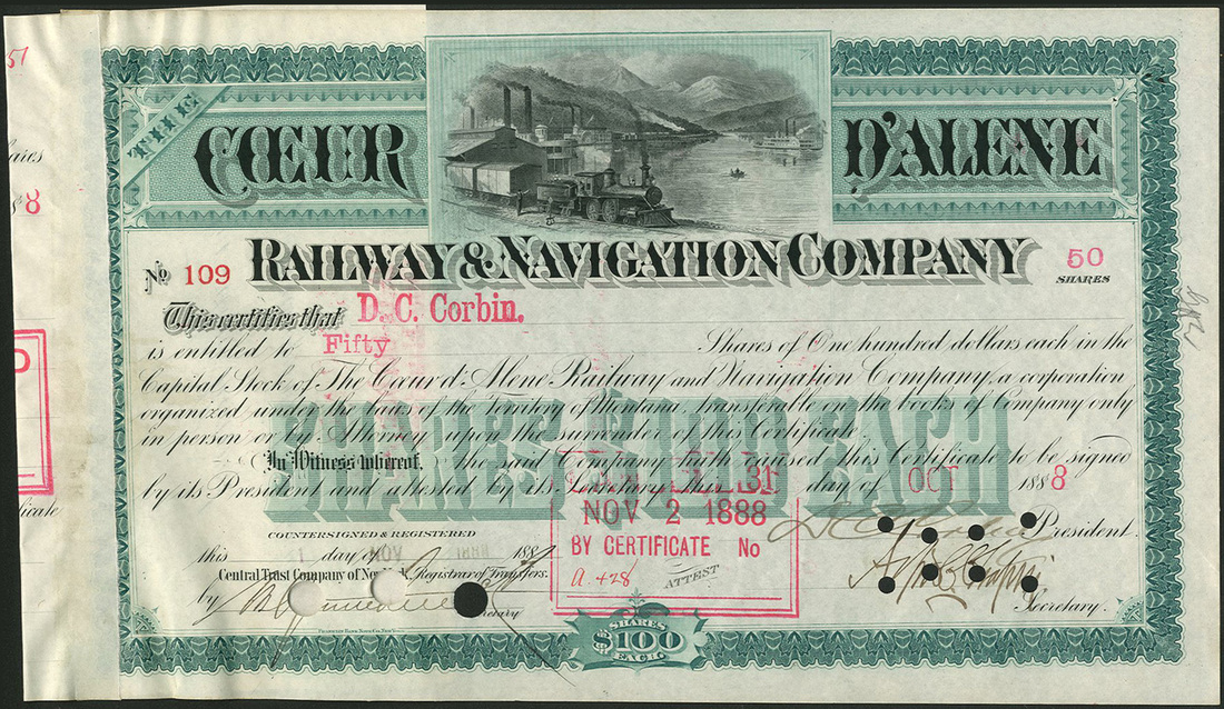 Coeur D'Alene Railway & Navigation Company, 100 shares, 188[7], #A305, and 50 shares, 188[8], #109, both signed by D.C.Corbin as President, the secons also issued to him and signed on the reverse, brown and green respectively, vignette of steam train top centre, stamped and hole punched cancelled, counterfoil re-glued at left, VF-EF (2)