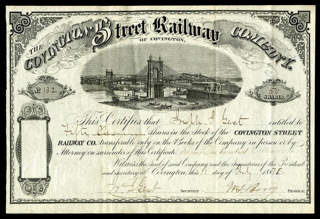Covington Street Railway Company (KY), $100 shares, 1871, No. 132, suspension bridge and steamboats, IU, VF+, full margins, and probably the finest known example.