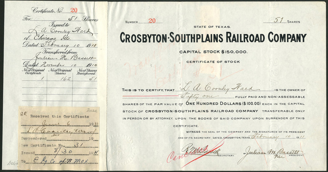 Crosbyton-Southplains Railroad Company (TX), $100 shares, 19[11], #20, black, red manuscript cancellation, counterfoil re-glued at left, revenue stamps on reverse, VF