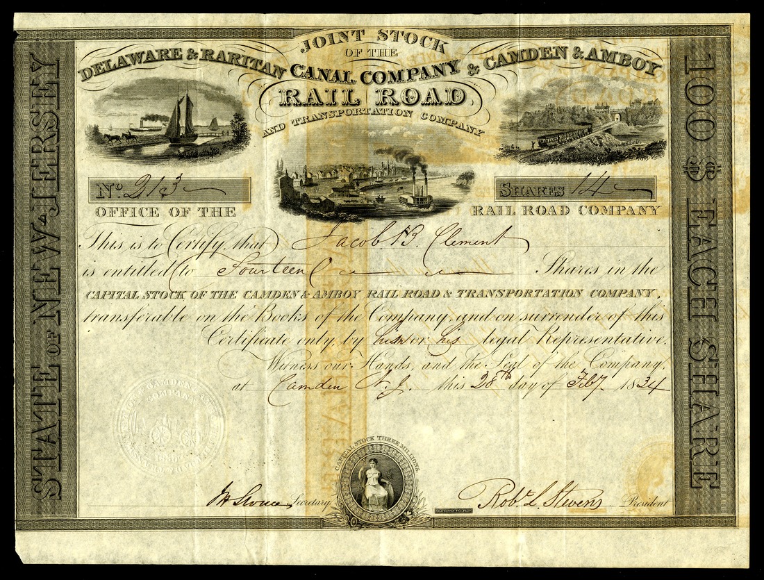 Delaware & Raritan Canal Company & Camden & Amboy Rail Road and Transportation Company (NJ), Camden, $100 shares, 1834, No. 213, signed by Robert L. Stevens as President, steamboat, canal barge, train, IU, VF+ details, a "shadow" reversed image across the center, as the result of being folded and left that way for decades.