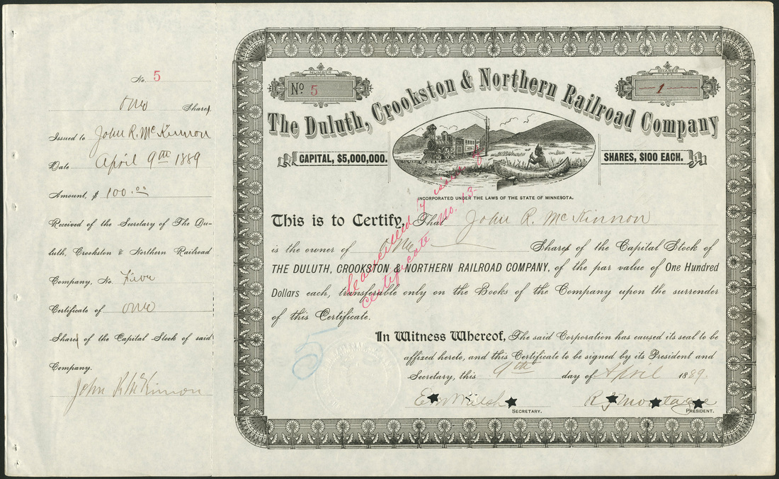Duluth, Crookston & Northern Railroad Co. (MN), $100 shares, 18[89], #5, steam train passing Native American in canoe, ornate border, black, punch cancelled, hand written 'cancelled' over face, counterfoil still attached, AEF