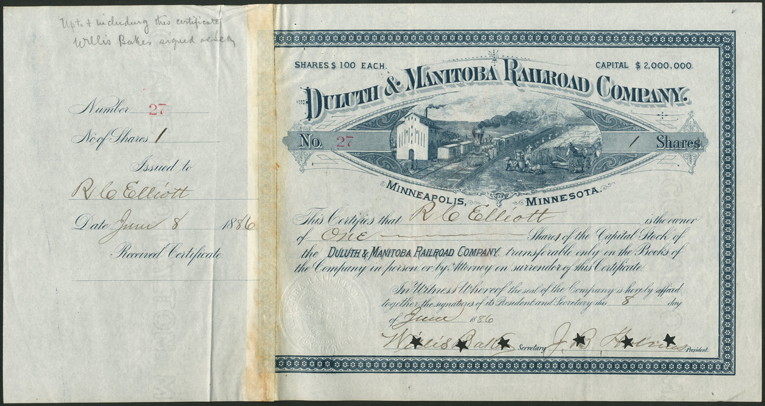 Duluth & Manitoba Railroad Co. (MN), $100 shares, 18[86], #27, lovely vignette of steam train passing wheat field and mill, ornate border, dark blue, punch cancelled, counterfoil re-glued at left, GVF