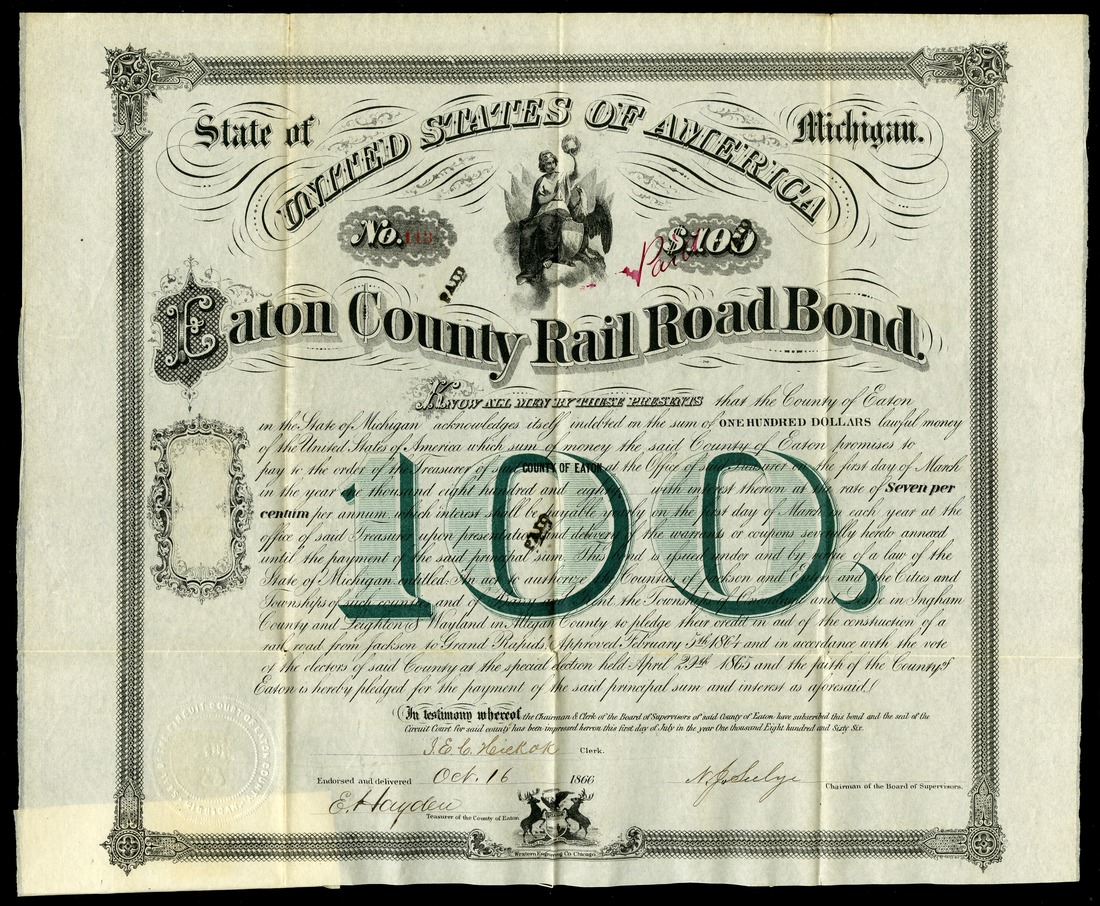 Eaton County Railroad Bond, (MI), Grand Rapids, 1866, $100 bond, green underprint, Liberty and eagle, IC, VF+.