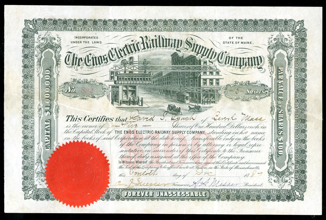 Enos Electric Railway Supply Company (ME), $100 shares, 1887, No. 892, red embossed seal and underprint, compelling central vignette of passenger cars suspended from a monorail, IU VF+. Almost as nice as the previous example. Consignor liked this issue so much that he bought a second example!
