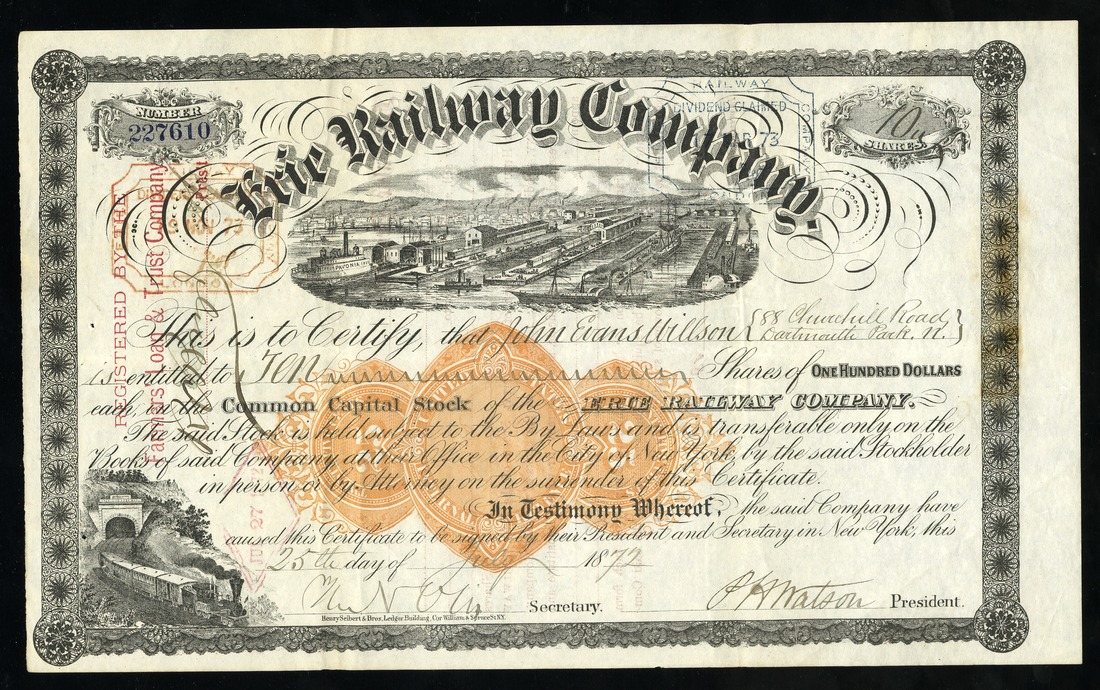 Erie Railway Company, (NY), $100 shares, 1872, No. 227610, ships, piers, steam ferry PAVONIA, train at lower left, imprinted orange 25 Cents revenue, IC, VF+.